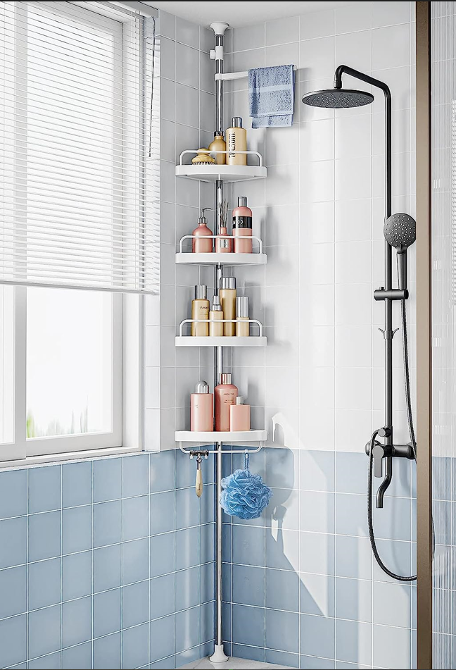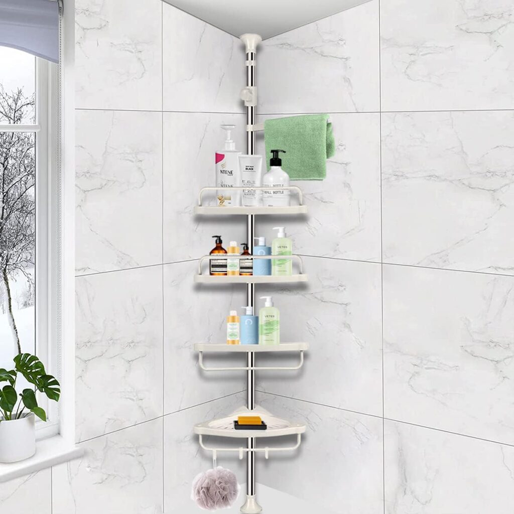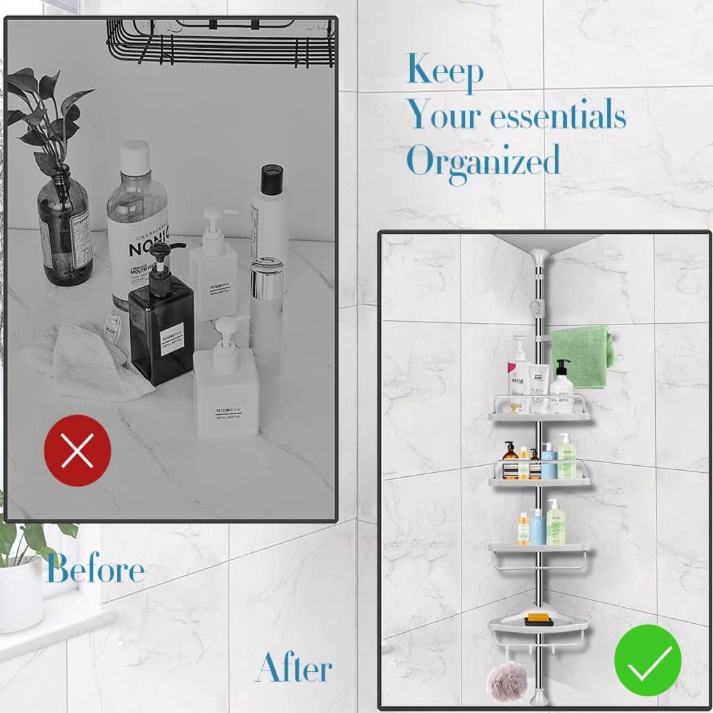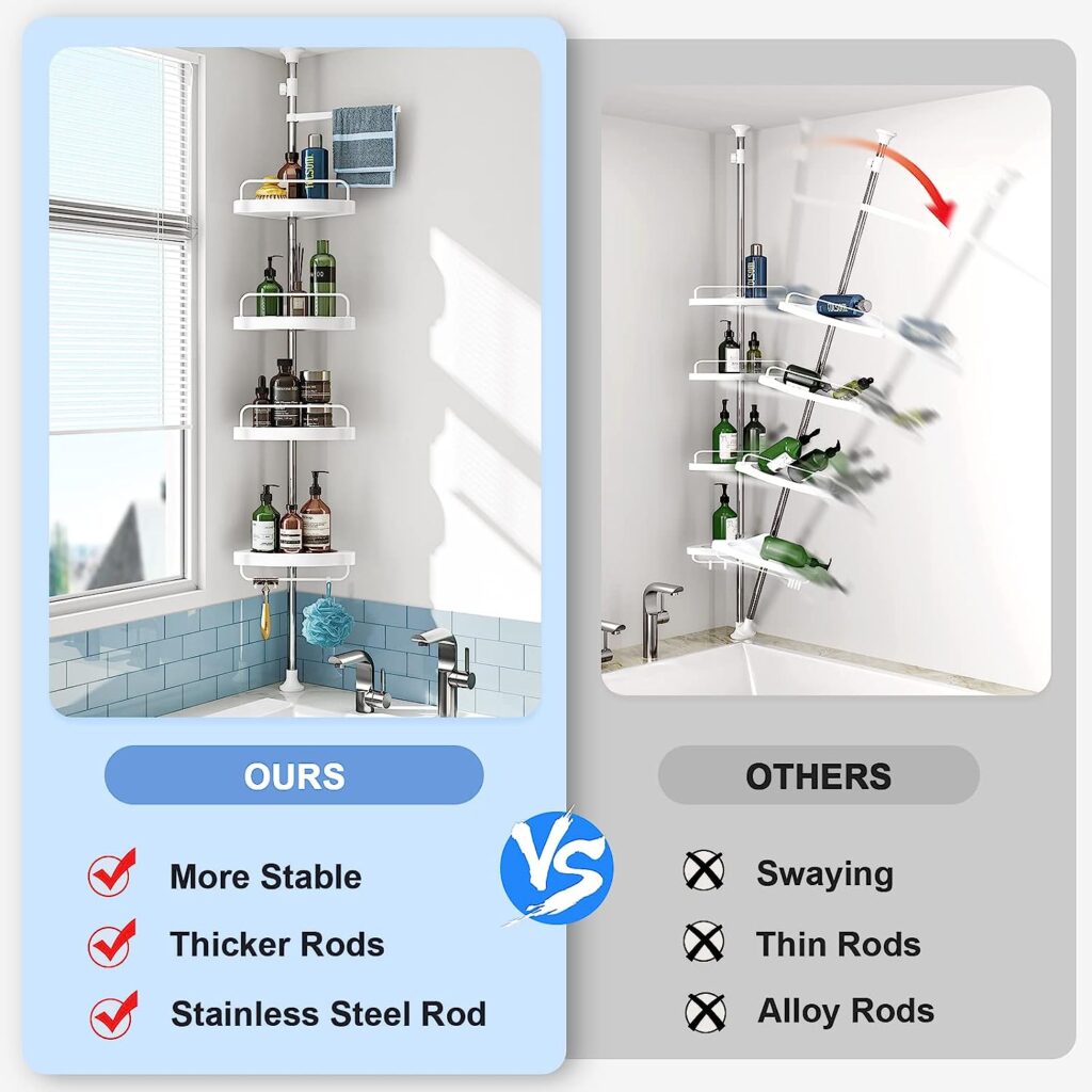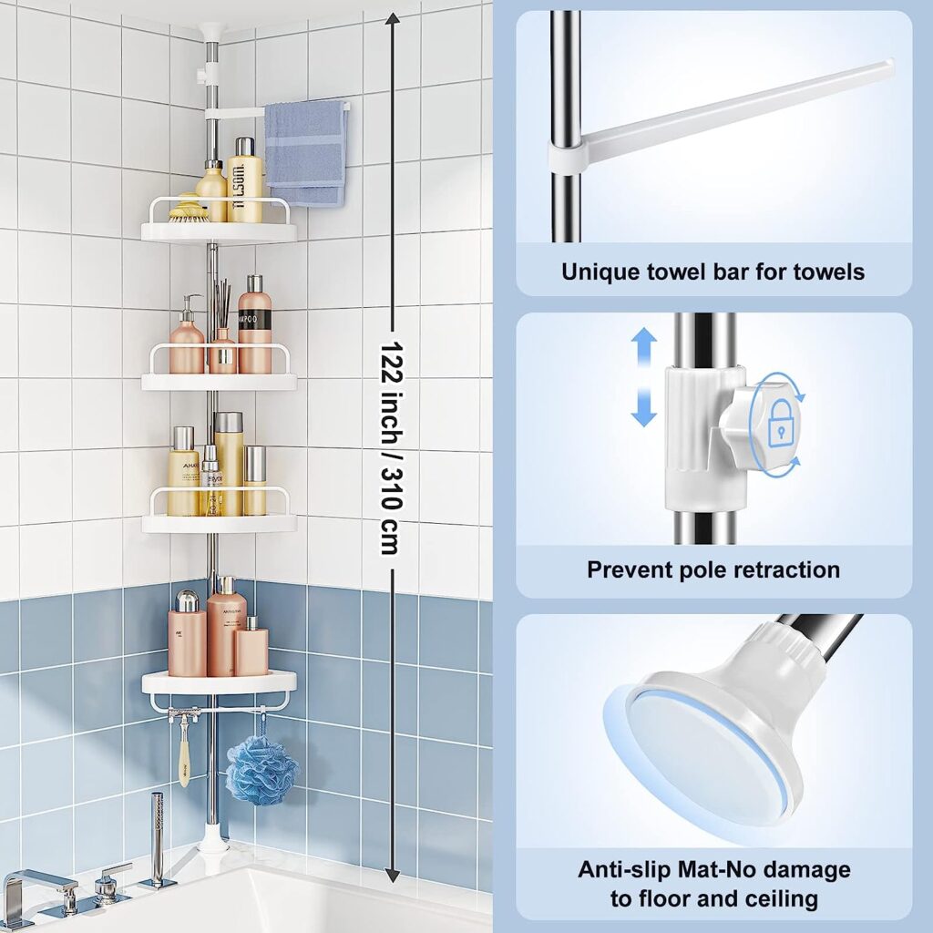Made of sturdy 304 stainless steel, which can effectively prevent pole from rusting. The open silicone ring makes it easier to adjust and install the corner shower shelf, to make room for tall bottles and to accommodate bottles of various sizes.Â